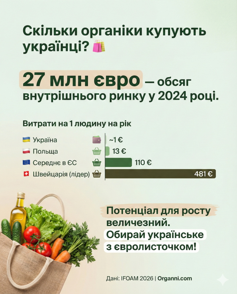У 2024 році загальний обсяг роздрібних продажів органічної продукції в Україні становив 27 мільйонів євро. Якщо розділити цю суму на орієнтовну кількість населення, ми отримуємо статистичний показник споживання на рівні 1 євро на людину на рік.